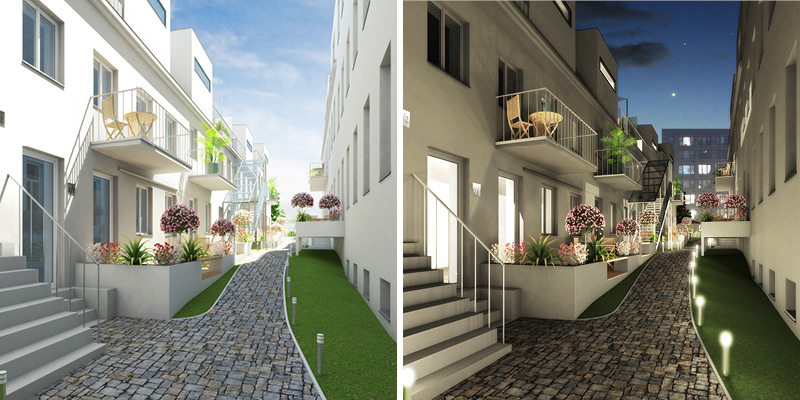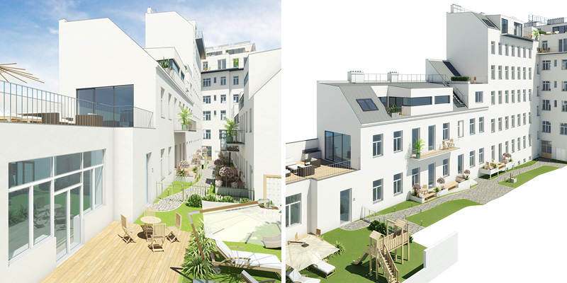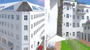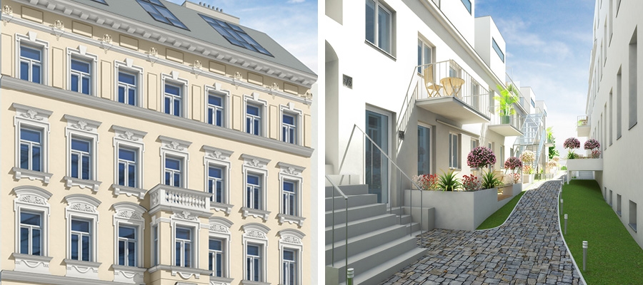 Auf rund 2.300 m², verteilt auf einen Straßen- und zwei Hoftrakte, entstehen hier insgesamt 30 intelligent geplante Vorsorge- und Eigentumswohnungen sowie 4 Dachterrassen-Wohnungen.