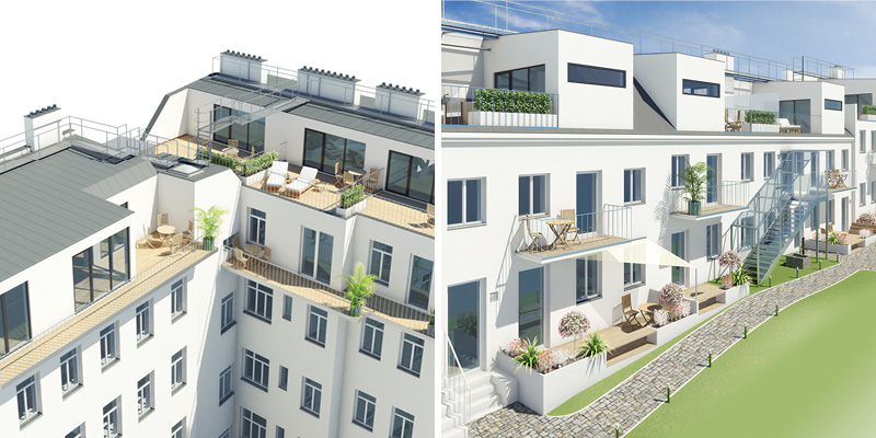 Im Dachgeschoß entstehen auf mehr als 300 m² Nettonutzfläche exklusive Dachterrassenwohnungen. Die Gesamtterrassenfläche von rund 330 m² und der atemberaubende Blick über Wien laden zu persönlicher Entfaltung und Entspannung ein.